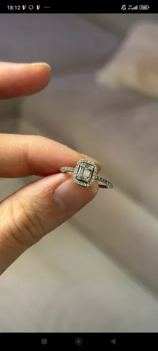 Precioso anillo de oro blanco de 18 quilates con diseño central de diamantes talla baguette, rodeado por un halo de pequeños diamantes. Elegante, femenino y atemporal. Un diseño que nunca pasa de moda y que destaca por su sofisticación y delicadeza. Las piedras se aprecian en detalle en las fotos. Perfecto tanto para darte un capricho como para regalo de aniversario, San Valentín o anillo compromiso. Para dedos finos, aproximadamente talla 9. #anillo #anillodiamante #oroblanco #18k #joyasmujer #joyaselegante #regalo #aniversario #sanvalentin #anillocompromiso #diamantes