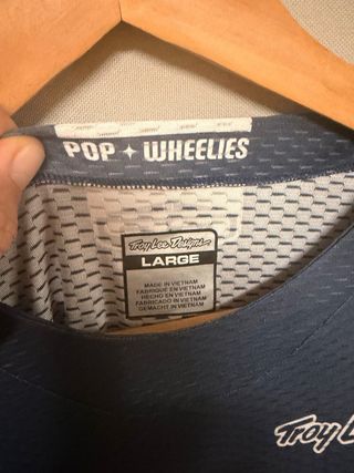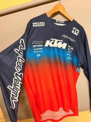 Camiseta original Troy Lee Designs talla L , nueva de manga larga con un diseño llamativo y degradado de azul a rojo. Presenta múltiples logos de patrocinadores. - Logo de Troy Lee Designs en la manga. - Logos de Nature's Bakery, PPG, KTM, 4WP, Method Race Wheels, Motorex, Seaspan, GoPro, Oakley y Pop+Wheelies en la parte delantera. - Tejido técnico transpirable.
