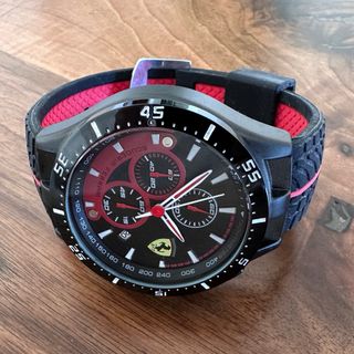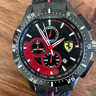 Reloj de pulsera con diseño inspirado en Scuderia Ferrari. - Esfera negra con detalles en rojo. - Correa negra con detalles en rojo. - Cronógrafo funcional. - Logo de Scuderia Ferrari.