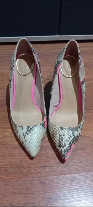 Elegantes zapatos de salón con un llamativo estampado de serpiente. - Diseño de punta fina. - Detalle interior en color rosa. - Acabado con efecto piel de serpiente.