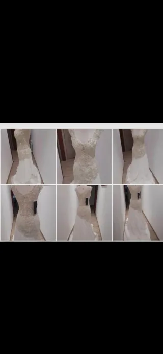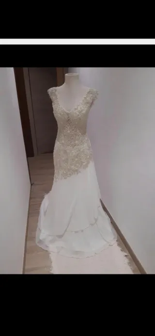 Elegante vestido de novia con un diseño único y detalles de pedrería. -Talla S/M. - Cuerpo con escote en V y mangas cortas. - Adornado con intrincados bordados y pedrería. - Falda fluida con varias capas de tela. - Diseño sirena que realza la figura.