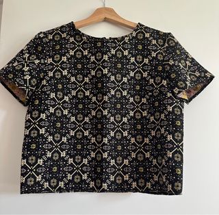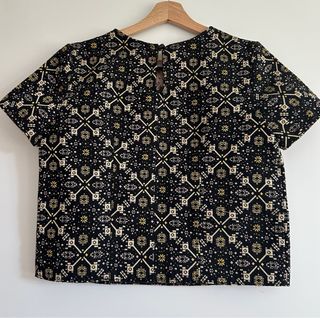 Camisa de manga corta con un estampado geométrico llamativo. - Diseño con motivos geométricos en contraste. - Tejido con textura. - Acabado con detalles deshilachados en el bajo y las mangas.