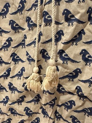 Vestido estampado con un bonito diseño de pájaros. - Estampado de pájaros en azul sobre fondo beige.