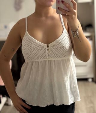 Bonita blusa blanca con detalle de crochet en la parte superior y tirantes. - Diseño con escote en V. - Cierre de botones en la parte frontal. - Tejido ligero y con textura.