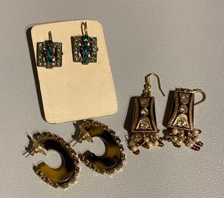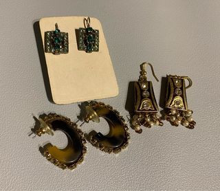 Conjunto de pendientes vintage. - Pendientes cuadrados con detalles verdes. - Pendientes colgantes con perlas y detalles dorados. - Pendientes de aro estilo tortuga con adornos dorados.