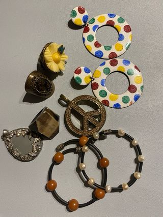 Conjunto variado de accesorios de joyería. - Anillo con diseño de flor y mariposa. - Anillo con piedra topacio. - Anillo madera de una pieza con forma geométrica. - Colgante con símbolo de la paz. - Pendientes redondos con diseño de lunares. - Pulseras adaptables con cuentas.