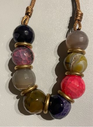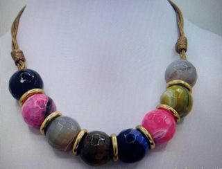 Elegante collar con cuentas de gemas narurales grandes 20mm y agatas de diversos colores, separadores y cierre en baño de oro. Cadena adaptable. - Cuentas de ágata facetada. - Diseño con cordón de cuero y cadena baño de oro. - Combinación de tonos vibrantes y neutros. longitud de 45 cm a 52 cm.