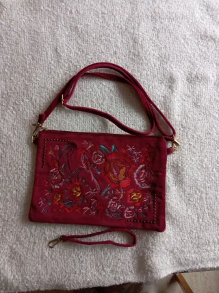 Elegante bolso de mano o bandolera con un diseño bordado. - Adornado con motivos florales y pájaros. - Detalles de tachuelas en los bordes. - Incluye correa de mano y correa bandolera. - Cierre de cremallera. _ 27cm de ancho _ 19 cm de largo