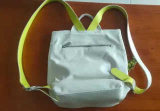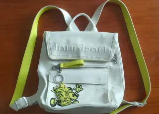Mochila de la marca Desigual con un diseño llamativo. - Color blanco con detalles en amarillo. - Adorno de personaje tipo Mickey Mouse. - Asa corta superior y dos asas ajustables. - Bolsillo frontal con cremallera.