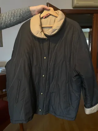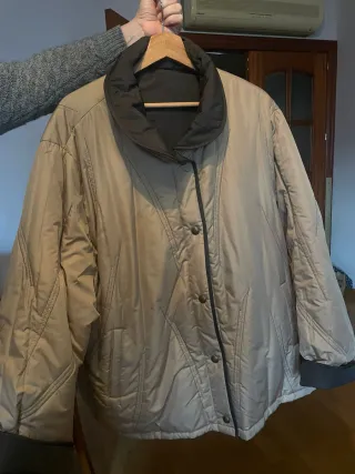 Preciosa cazadora reversible, ideal para cualquier ocasión. Marrón/beig. Casi sin uso,aún lleva los bolsillos sin abrir de la parte clara. - Diseño moderno y versátil. - Cierre de botones, pespuntes con hilos del otro color. Medidas en fotos, pone T 50 pero es más grande.