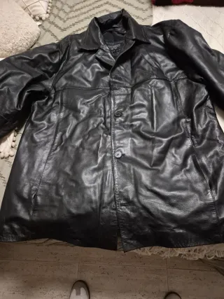 Chaqueta de cuero de corte clásico. - Diseño con solapas. - Cierre de botones. - Bolsillos frontales. _ pequeños desgastes en los ojales Y en los puños