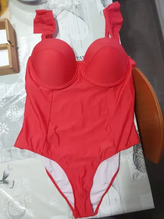 Bañador de una pieza con un diseño favorecedor. - Copas con soporte incorporado. - Tirantes ajustables con volantes. - Corte de pierna alto. Sin estrenar, porque me quedaba grande de cuerpo. Ideal si tienes mucho pecho