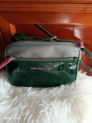 Bolso de la marca Agatha Ruiz de la Prada con un diseño moderno. - Combinación de colores gris y verde. - Acabado charol en la parte inferior. - Correa ajustable.