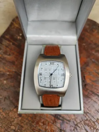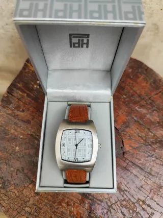 Elegante reloj de cuarzo con correa de cuero marrón y caja plateada. - Diseño de esfera con números romanos y patrón PH. - Correa de cuero con textura. - Caja de metal con acabado plateado.