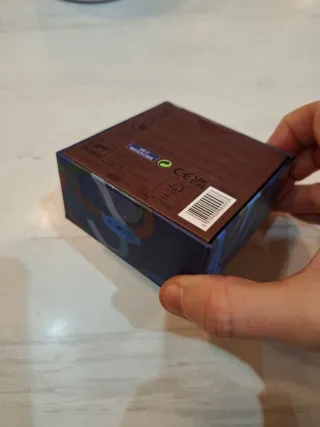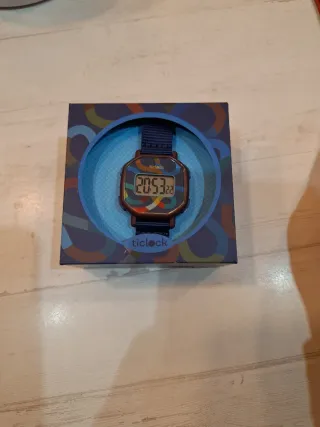 Reloj de pulsera Ticlock con un diseño moderno y llamativo. - Correa de tela azul. - Esfera cuadrada con patrón multicolor. - Pantalla digital.