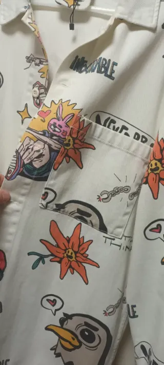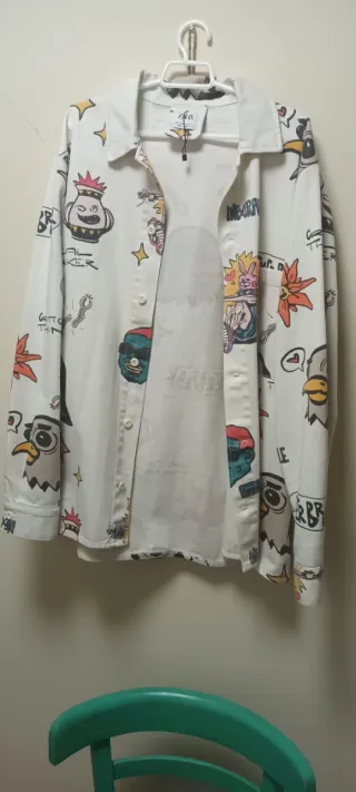 Camisa de manga larga con un diseño llamativo y original. - Estampado integral con personajes y elementos gráficos. - Cuello camisero. - Cierre de botones. - Puños abotonados.