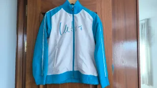 Chandal deportivo Umbro con un diseño moderno y cómodo. - Mangas y cuello en color azul. - Cuerpo principal en color blanco. - Detalles de líneas blancas en las mangas. - Puños y cintura elásticos en azul. - Talla S.