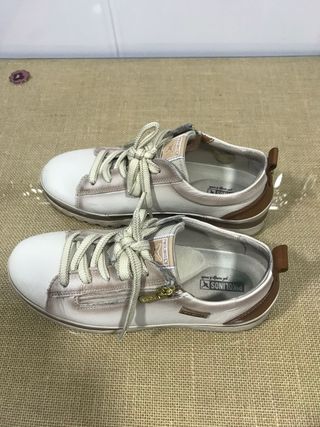 Zapatillas Pikolinos de mujer en tonos marrón y blanco. Cuentan con un diseño moderno y detalles que las hacen únicas. - Cierre con cordones. - Detalle de cremallera lateral. - Tirador trasero para facilitar su puesta. - Suela de goma.