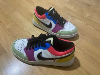 Zapatillas deportivas Nike Air Jordan 1 Low con un diseño multicolor y blanco. Perfectas para un estilo urbano y casual. - Diseño con paneles de diferentes colores. - Logo de Nike en el lateral. - Cierre con cordones negros.