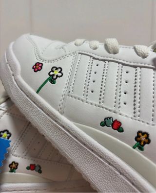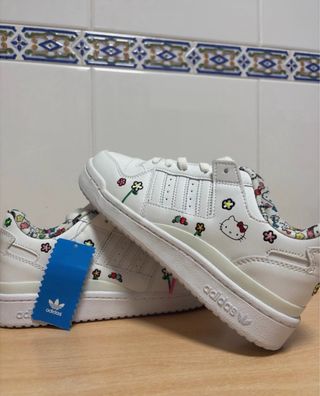 Zapatillas de edición especial de Adidas con un divertido diseño de Hello Kitty y flores. - Estampado de Hello Kitty y motivos florales. - Cierre de cordones. - Detalle de las tres rayas de Adidas. No conservo la caja por falta de espacio