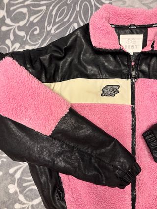 Cazadora de la marca Grimey con un diseño moderno y llamativo. - Combinación de materiales: polipiel y tejido sherpa. - Paneles de color negro y rosa. - Detalle de banda central en color crema. - Parche con logo en el pecho.
