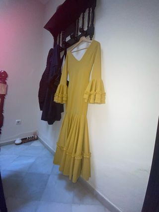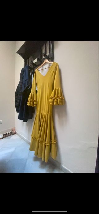 Precioso traje de flamenca en color mostaza, talla 3. Ideal para lucir en cualquier evento. - Elegante diseño. - Confeccionado con tejido de calidad. - Falda con volantes.