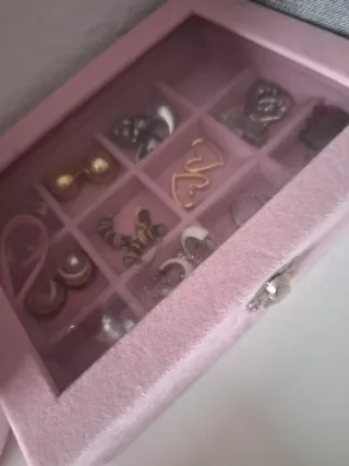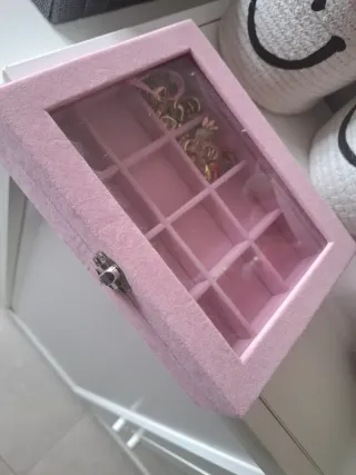 Elegante caja joyero con acabado aterciopelado y tapa transparente. - Diseño con múltiples compartimentos para organizar tus joyas. - Cierre metálico para mayor seguridad. - Interior forrado en suave tejido rosa.