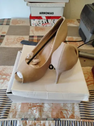 Elegantes zapatos de tacón con diseño peep toe. - Color beige. - Tacón de aguja. - Material de ante.