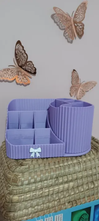 Práctico organizador de sobremesa con varios compartimentos para brochas, maquillaje y labiales. Para organizador de oficina, Presenta un diseño moderno con un pequeño lazo decorativo blanco en la parte frontal. - Múltiples divisiones para una mejor organización. - Acabado en color morado. - Detalle de lazo blanco. - Más colores y modelos diferentes, preguntame