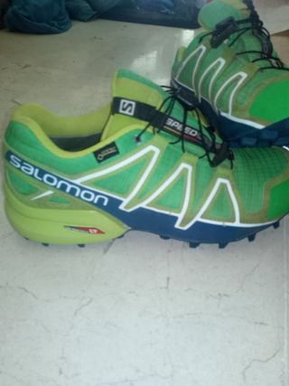 Zapatillas de trail running Salomon Speedcross 4 con tecnología Gore-Tex. - Diseño en verde y azul. - Cierre con cordones. - Suela con tacos para agarre en terrenos difíciles. Usadas solo una vez,se ve la plantilla q no tiene desgaste,y me quedaban pequeñas,y llevan un año guardadas,no tienen su caja original q se tiro por error