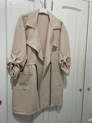 Chaqueta fina de color beige, ideal para entretiempo. Presenta un diseño moderno y versátil. - Cierre con botón. - Cordón ajustable en la cintura. - Bolsillos frontales. - Mangas enrollables con botón.