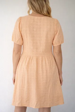 Vestido Naf Naf de manga corta con un diseño encantador. - Escote en V con volantes. - Estampado de pequeños círculos. - Cintura marcada. - Tejido ligero y fresco.