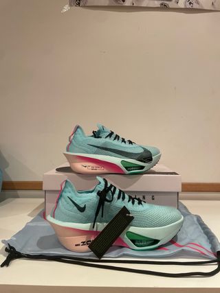 Zapatillas de running Nike Zoom Alphafly 3. - Diseño moderno en tonos turquesa y rosa. - Suela con tecnología Zoom Air. - Cierre con cordones negros.
