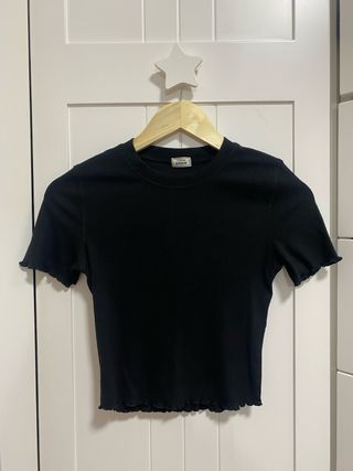 Top negro de manga corta con un diseño moderno y favorecedor. - Tejido acanalado. - Mangas y bajo con detalle de volantes. - Cuello redondo.
