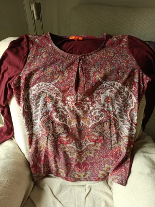 Camiseta de manga larga con un estampado vibrante y detallado. - Diseño paisley en tonos rojos y multicolor. - Cuello redondo con detalle de pliegues.