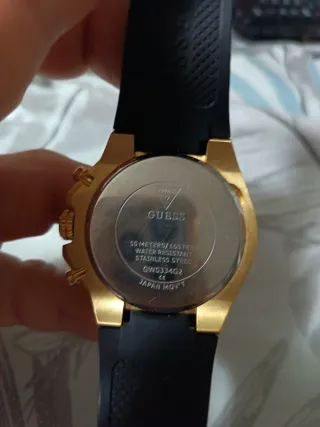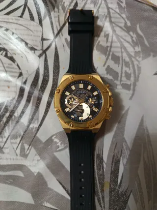 Elegante reloj Guess con detalles dorados y correa negra. Se encuentra en perfectas condiciones. - Diseño moderno y sofisticado. - Combinación de colores versátil.