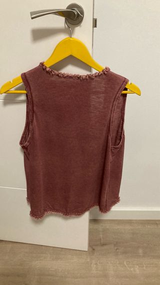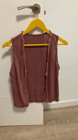 Chaleco ligero con un diseño moderno y detalles de flecos. - Acabado deshilachado en cuello, sisas y bajo. - Tejido suave y cómodo.
