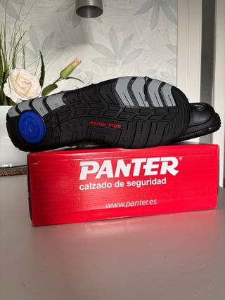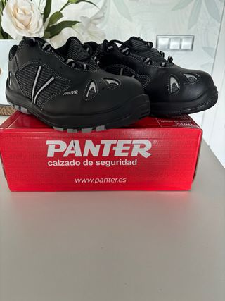 Calzado de seguridad Panter en color negro y gris. Diseñados para ofrecer protección y comodidad. - Cierre con cordones. - Detalle de líneas blancas y grises en los laterales. - Logo de la marca en la lengüeta y en el lateral.