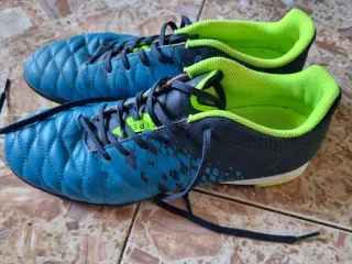 Botas de fútbol sala con un diseño moderno y llamativo. - Parte superior acolchada en azul. - Detalles en verde neón en el cuello y la suela. - Patrón de rombos en contraste en el lateral.
