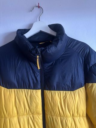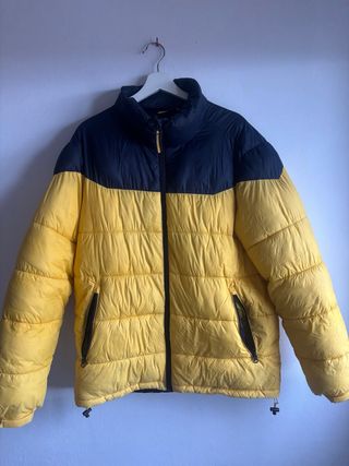 Chaqueta de invierno Pull&Bear con un diseño bicolor llamativo. - Parte superior azul marino. - Parte inferior y mangas en amarillo vibrante. - Cuello alto. - Cierre de cremallera frontal. - Bolsillos laterales con cremallera.