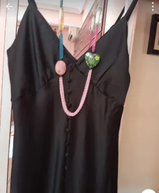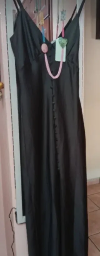 Vestido lencero de satén con un diseño elegante y sofisticado. Ideal para ocasiones especiales o para añadir un toque de glamour a tu vestuario. - Tejido de satén suave al tacto. - Tirantes finos ajustables. - Detalle de botones en la parte frontal. Nuevo con etiqueta, da desde una 34 hasta una 40