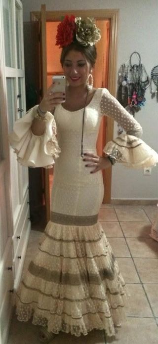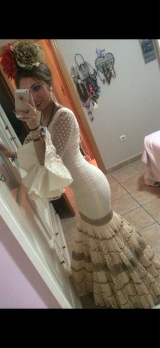 Vestido de flamenca en tono camel, con detalles en marrón y beige. Un diseño elegante y llamativo. - Mangas acampanadas con volantes. - Cuerpo ajustado con detalles de lunares. - Falda con varios volantes y detalles de rayas. - Adornado con encaje en los volantes.