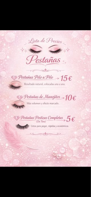 hago pestañas adomicilio a un precio muy economico.SOLO ME DESPLAZO A LO SITIOS QUE PONE EN LA CARTA!!