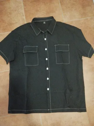 Camisa de lino negra, con costuras blancas y botones blancos. Es una prenda elegante y cómoda. - Diseño con dos bolsillos en el pecho. - Cuello camisero. - Manga corta.