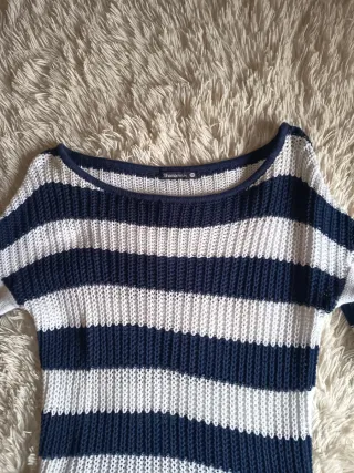 Jersey de punto con diseño de rayas marineras. Es una prenda cómoda y versátil. - Diseño de rayas horizontales. - Cuello barco. - Manga larga.