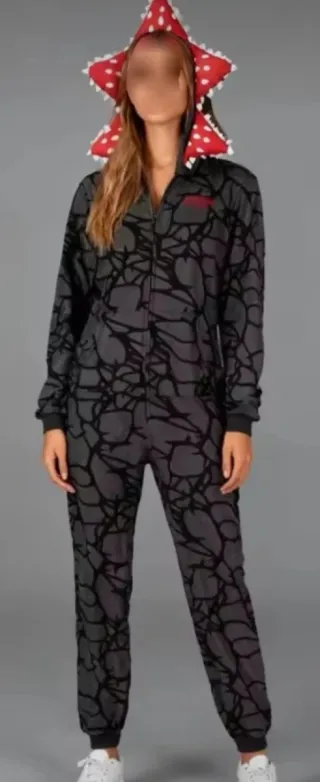 Nuevo a estrenar. Mono de una pieza Sirve como disfraz Es muy agradable y sienta súper bien. Da talla Pijama con capucha inspirado en el Demogorgon de Stranger Things. El diseño presenta un estampado abstracto en tonos grises y negros, con detalles rojos y blancos en la capucha que simulan la cabeza del monstruo. - Cierre de cremallera frontal. - Capucha con detalles de dientes. - Estampado temático de Stranger Things.