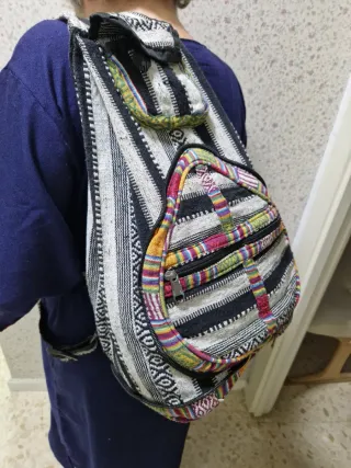 Mochila estilo Nepal con un diseño vibrante y llamativo. - Tejido con rayas y patrones étnicos. - Compartimento principal con cremallera. - Bolsillo frontal adicional con cremallera. Plegable multicolor. En perfecto estado. Gran capacidad. Muy poco usada.
