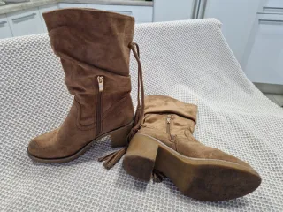 Botas de mujer de estilo casual. - Material tipo ante. - Detalle de cremallera lateral. - Adorno de flecos. - Tacón grueso.Botas de tacon. Talla 37. En perfecto estado. Solo un uso.