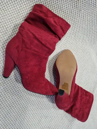 Botines de mujer con un diseño moderno y elegante. Color rojo. Material tipo ante. - Tacón gradual. - Caña arrugada. -Solo dos usos. En perfectas condiciones.