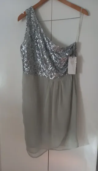 💐 Bonito y cómodo vestido con escote asimétrico y lentejuelas, con cremallera y forro, ideal para ocasiones especiales -Nuevo con etiquetas 🏷 -Talla: 42/ XL -Precio en tienda: 129,90€ -Material: 100% poliéster (Primera imagen de referencia)